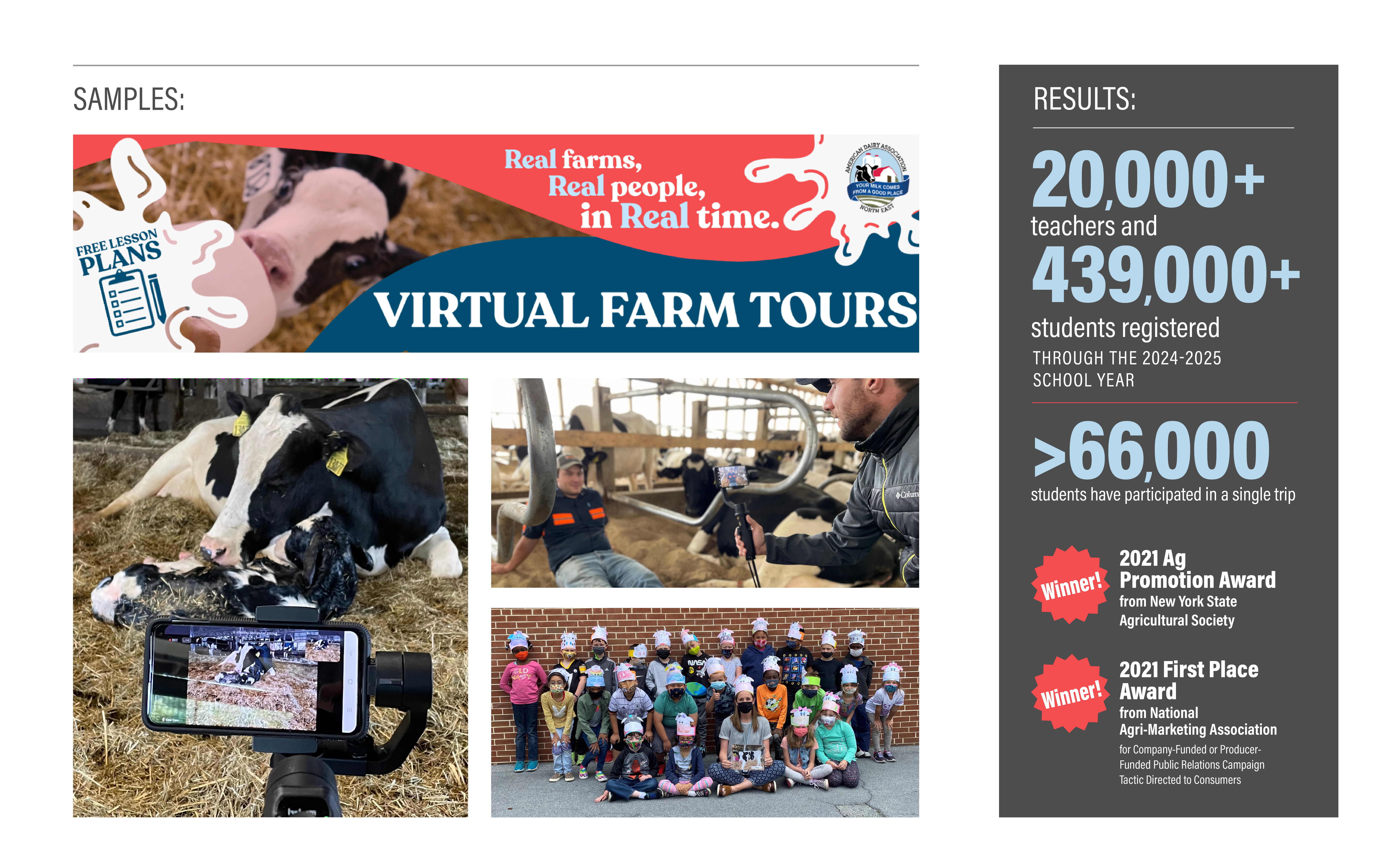 The Work American Dairy Association North East partnered with Shift•ology Communication’s Virtual Farm Trips team in 2018 to develop an ongoing series of LIVE Virtual Farm Trips targeting K-12 students within the association’s region, including the states of New York, Pennsylvania, New Jersey, Maryland, Delaware and parts of northern Virginia. Shift•ology provides the technical and logistical support to produce the trips, allowing ADANE and its farmers to do what they do best — share and show the story of dairy farming. These trips connect students directly with real farmers for a live dairy tour and conversation to learn firsthand about dairy farming, all from the comfort of their classroom. Students see behind the scenes; including where cows are milked, inside barns, and tractors at work, as they experience all aspects of a farm.